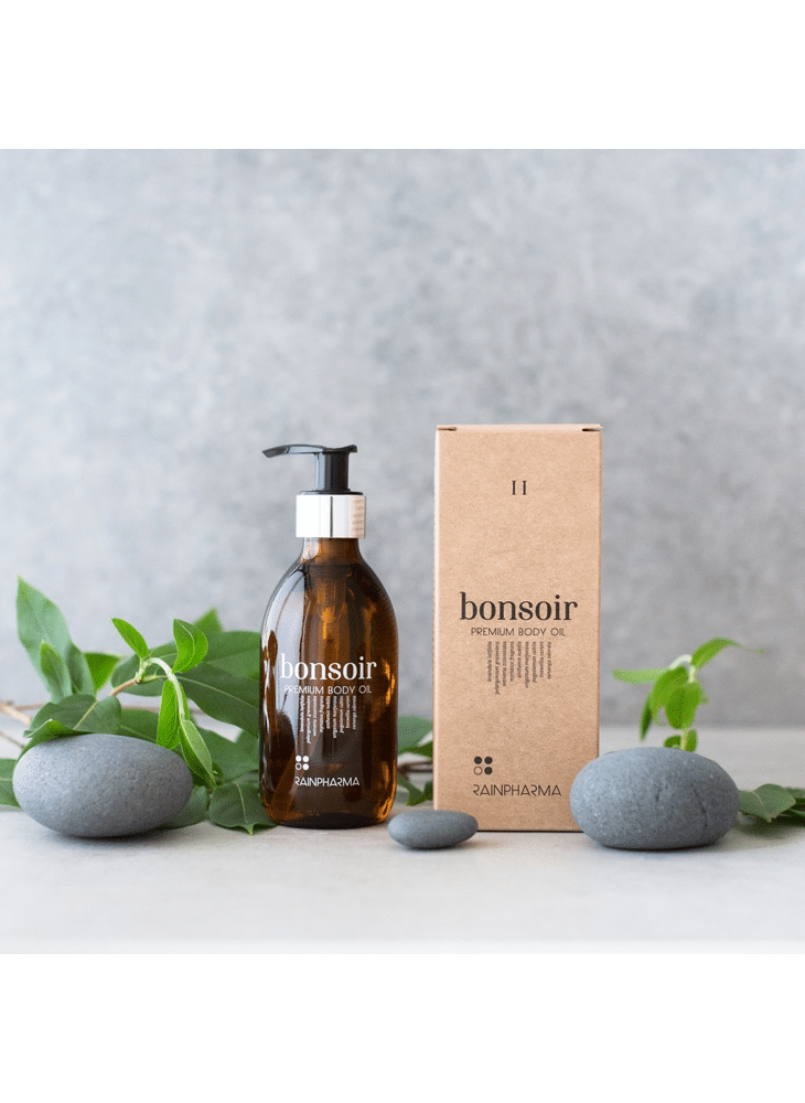Samen met de beste aromatherapeuten van België ontwikkelde RainPharma twee premium douchelijnen. Bonjour, om energiek en geïnspireerd aan je dag te beginnen en Bonsoir, om heerlijk ontspannen de nacht in te gaan. Bonsoir Premium Body Oil is een rijke, niet klevende olie die je lichaam in een heerlijk geurende rust wikkelt voor het slapengaan. De verfijnde, aromatherapeutische geur werkt kalmerend en zorgt ervoor dat je letterlijk slaapt als een roosje. ’s Ochtends sta je als herboren weer op, met een zijdezachte huid. Verjongingsoliën uit jojoba, bernagie, duindoorn, arganpitten en rozebottel, alom geprezen om hun beschermende, rimpel-reducerende en verstevigende karakter, zorgen voor een extra weelderige toets. Om de barrièrefunctie van je huid te versterken, schakelden we een aantal plantaardige krachtpatsers in. Essentiële vetzuren en extracten uit mariadistel , tarwekiemen, magnolia en rode bieten zorgen voor een rustige en stralend gezonde huid. Trakteer jezelf op een heerlijk ontspannen inslaapritueel.