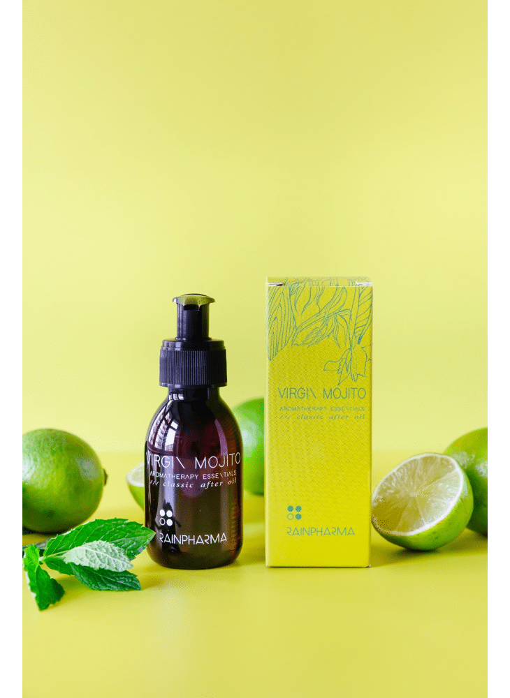 Met After Oil Virgin Mojito maakten we een zomerse variant van deze bijzondere aromatische huidolie die je gebruikt in de douche. De unieke blend van vijf essentiële oliën werkt stimulerend en verkoelend. Limoen en citroen zorgen voor de levendige frisse en fruitige geur. Pepermunt en kruizemunt voegen een licht zoete, sterke muntachtige noot toe die voor extra verfrissing zorgt en vermoeide of verkrampte spieren tot rust brengt. Jeneverbes tenslotte zorgt voor een kruidige finishing touch en maakt het geheel extra stimulerend.