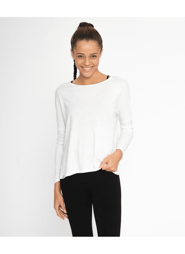 Daksha is een T-shirt met lange mouwen van katoen en modal. De ideale pasvorm voor je yogabeoefening: aansluitende mouwen, body is vloeiend, met de split aan de zijkant en langere achterkant.