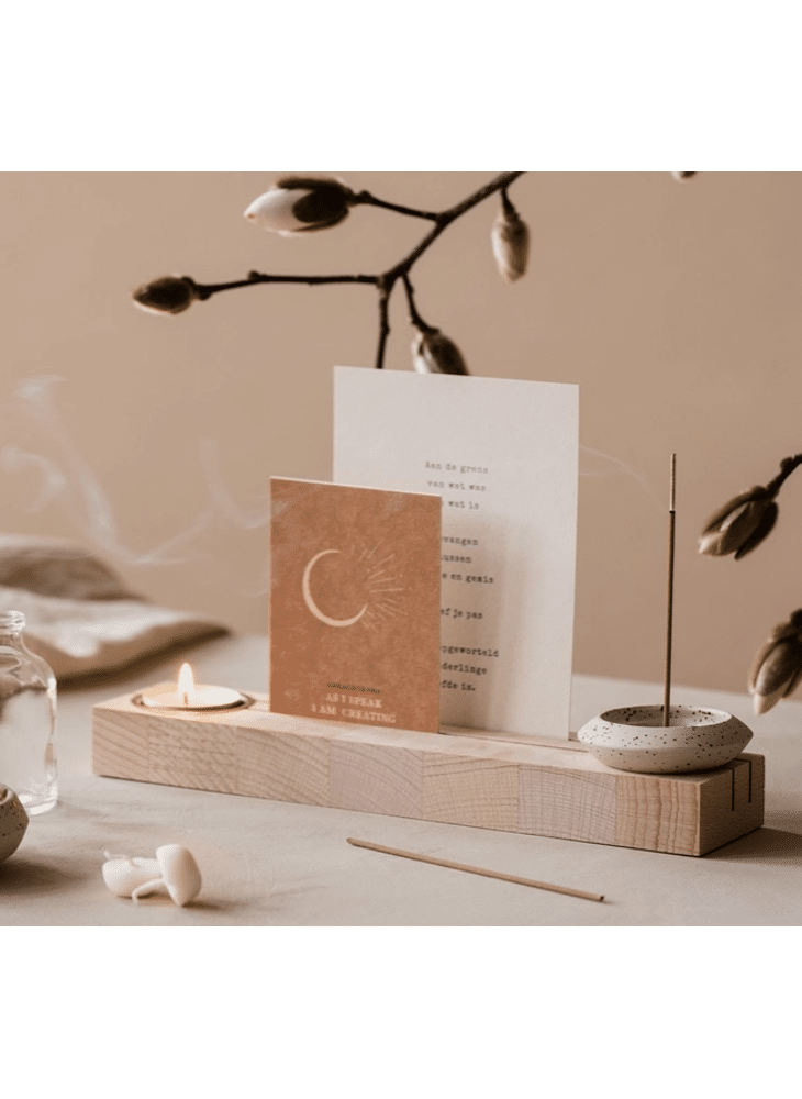 B 26 cm x h 2,7 cm x d 5,5 cm / beuken / glazen vaasje h 7 cm + waxinelichtje / 2 palo santo wierookstokjes / handgedraaide wierookhouder / gouden theelichthouder